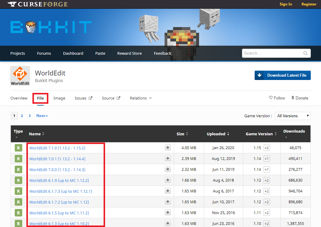 3. 원하는 버전의 월드에딧이 없을 경우 상단의 File 탭을 눌러 버전에 맞는 WorldEdit을 선택하여 다운로드 합니다.
